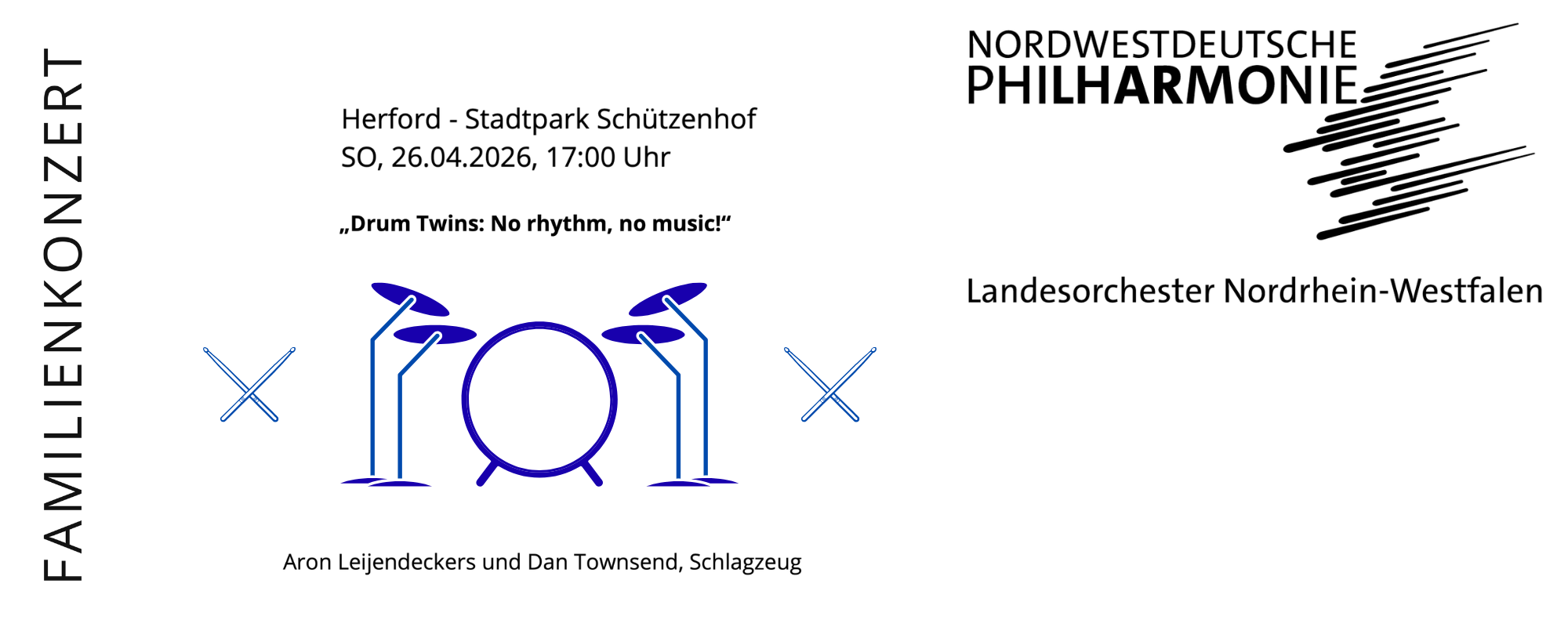 Wenn Rhythmus zur Sprache wird und Bewegung zur Musik, dann sind sie nicht weit: die Drum Twins. Das virtuose Percussion-Duo um Aaron Leijendeckers und Dan Townsend steht für Konzerterlebnisse, die weit über das bloße Zuhören hinausgehen. Beim Familienkonzert am 26.04.2026 um 17:00 Uhr im Stadtpark Schützenhof in Herford geht es um Energie. Um Spaß. Um Bewegung – und um pure Lebensfreude. Sobald die beiden mit ihrem vielseitigen Percussion-Instrumentarium die Bühne betreten, wird der Konzertsaal der Nordwestdeutschen Philharmonie zum pulsierenden Klangraum, in dem kein Fuß still bleibt.